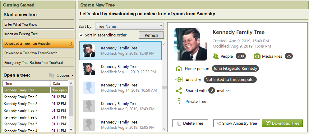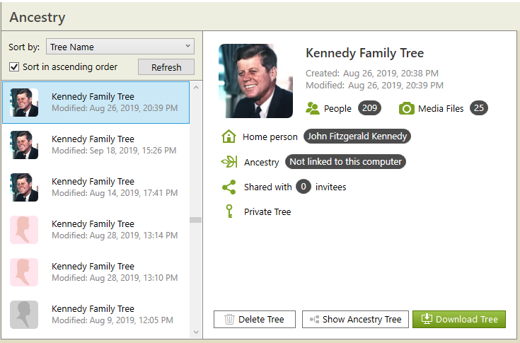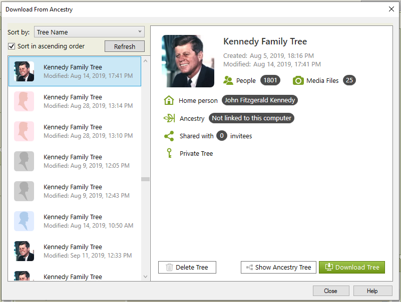 2. Select Download a Tree from Ancestry, find the tree you want to download in the list, and click the Download Tree button in the lower-right corner.