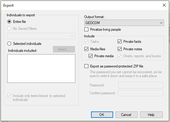 Select Entire file, change the Output format to GEDCOM, and make sure all of the checkboxes in the Include section are selected.