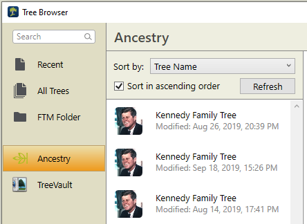 2. In the left part of the window, select the Ancestry group of trees. A list of your Ancestry trees appears to the right.