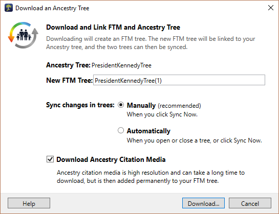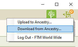 1. Click the Ancestry Sync icon on the far right of the main toolbar, and then click Download from Ancestry in the drop-down list. The Download From Ancestry window appears.
