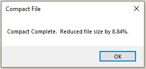 Your file will now be compacted. Depending on the size of the file and the amount by which it is compacted, this can take some time. When this process finishes, you will see a window stating the compact is complete, and that the file size was reduced by a percentage. Note the percentage and click OK.