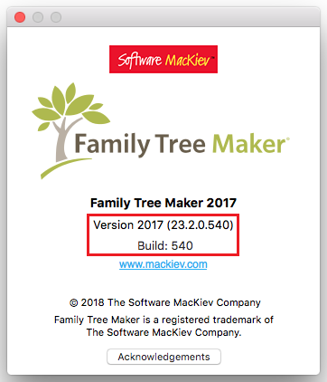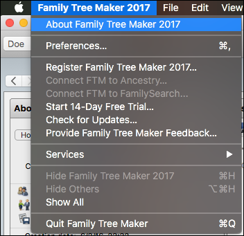 If you are a Mac user, just open Family Tree Maker, go to the Family Tree Maker 2017 (or 2019/2024) menu, then click on About Family Tree Maker 2017 (or 2019/2024).