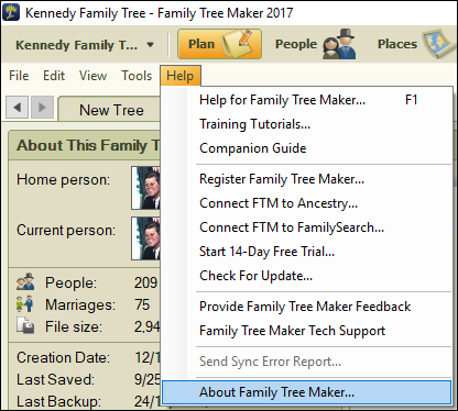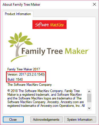 It's easy to check what specific version and build number of Family Tree Maker you currently have installed. Just follow the steps below for Windows or Mac, and if you aren't using the latest version listed here, use the links provided to get fully up to date.