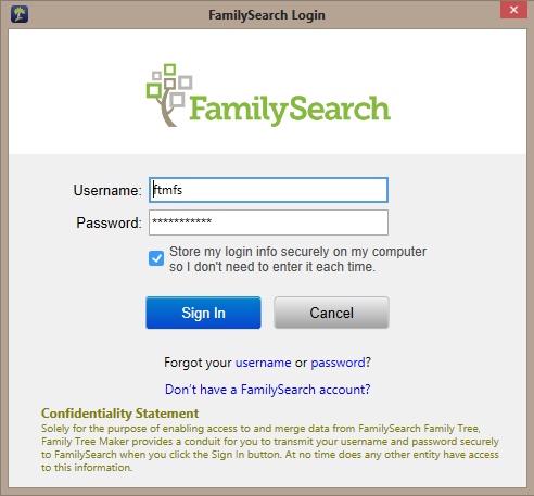 If you don't have a FamilySearch account, click the “Don't have a FamilySearch account?” link in the login dialog to open the FamilySearch website in your browser and create a free account. If you are unable to log in to your FamilySearch account, you may need to check your username or reset your password using the links under the "Sign In" and "Cancel" buttons.