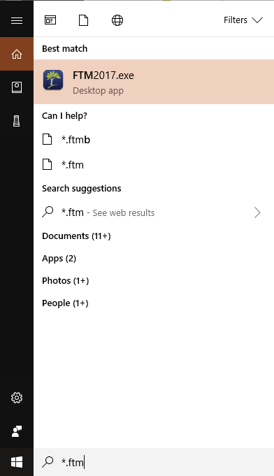 Search will automatically start looking for files. Files that are found will be displayed above the search field, as well as other search options to help you find what you're looking for more easily (for example, clicking Documents should filter in results found in the Documents folder on your computer, where FTM tree files are stored by default).