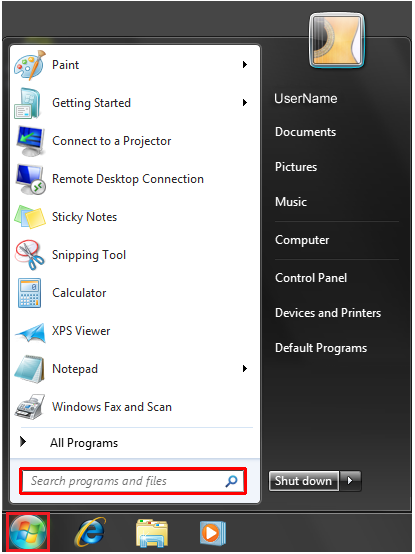 - Click the Windows icon on your taskbar and click the Search programs and files field to place your cursor there