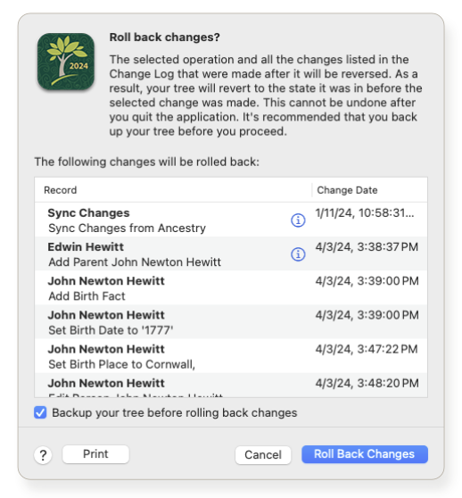 8. Before making any major changes to your tree, it’s best to create a backup. Select the Backup your tree checkbox; then click Roll Back Changes.