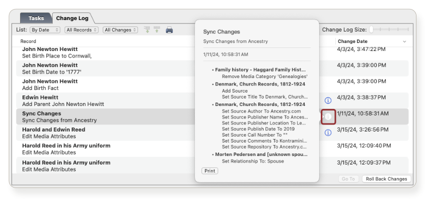 With Family Tree Maker’s Turn Back Time feature, you can easily undo mistakes in your tree without having to manually backtrack through all your changes. This feature can keep track of your last 5,000 actions, including extensive changes like merging trees, allowing you to revert your tree to its previous state with a simple click. Plus, Turn Back Time works even if you’ve closed and reopened your tree since making the changes.