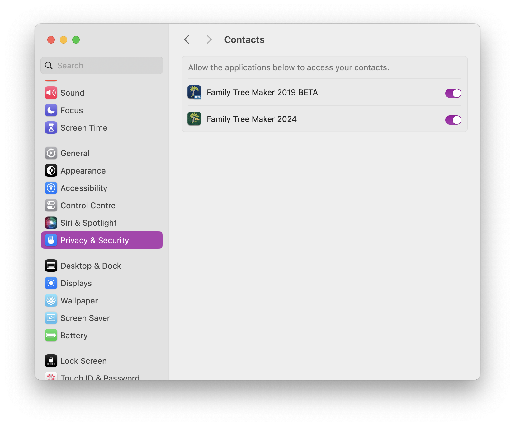 You will need to open the Privacy & Security pane in System Settings, select Contacts, and turn on access for Family Tree Maker 2024.