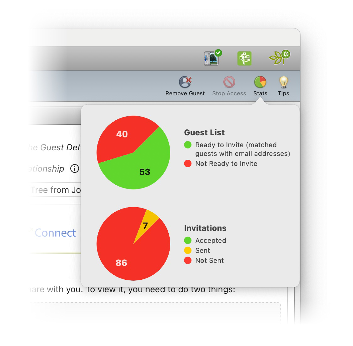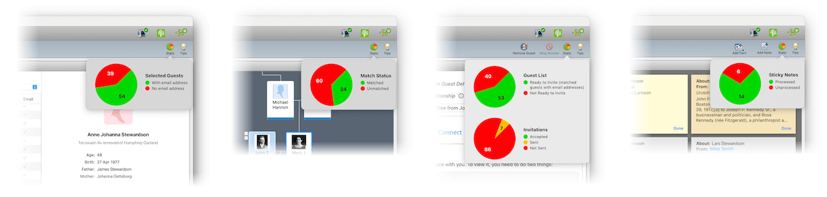 We’ve added a contextual statistics popup window on each tab of the new Connect workspace. Just click the Stats button on the toolbar for a quick summary of statistics relevant to that tab. You’ll see details like how many invitations to fact-check your tree you’ve sent out, how many of them were accepted, and how many Relative Hint™ sticky notes you’ve received as a result.