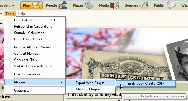 Once you download and run the installer, open Family Tree Maker, open a family tree you'd like to use with the plugin, then go to the Tools menu, through Plugins to Export With Plugin, and click on Family Book Creator. (see example below)